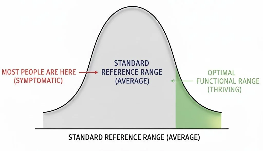 A reference range is an average of the sick people who visit labs. Being 'in range' just means you aren't dying. It doesn't mean your thyroid is working, your gut is sealed, or your hormones are balanced.